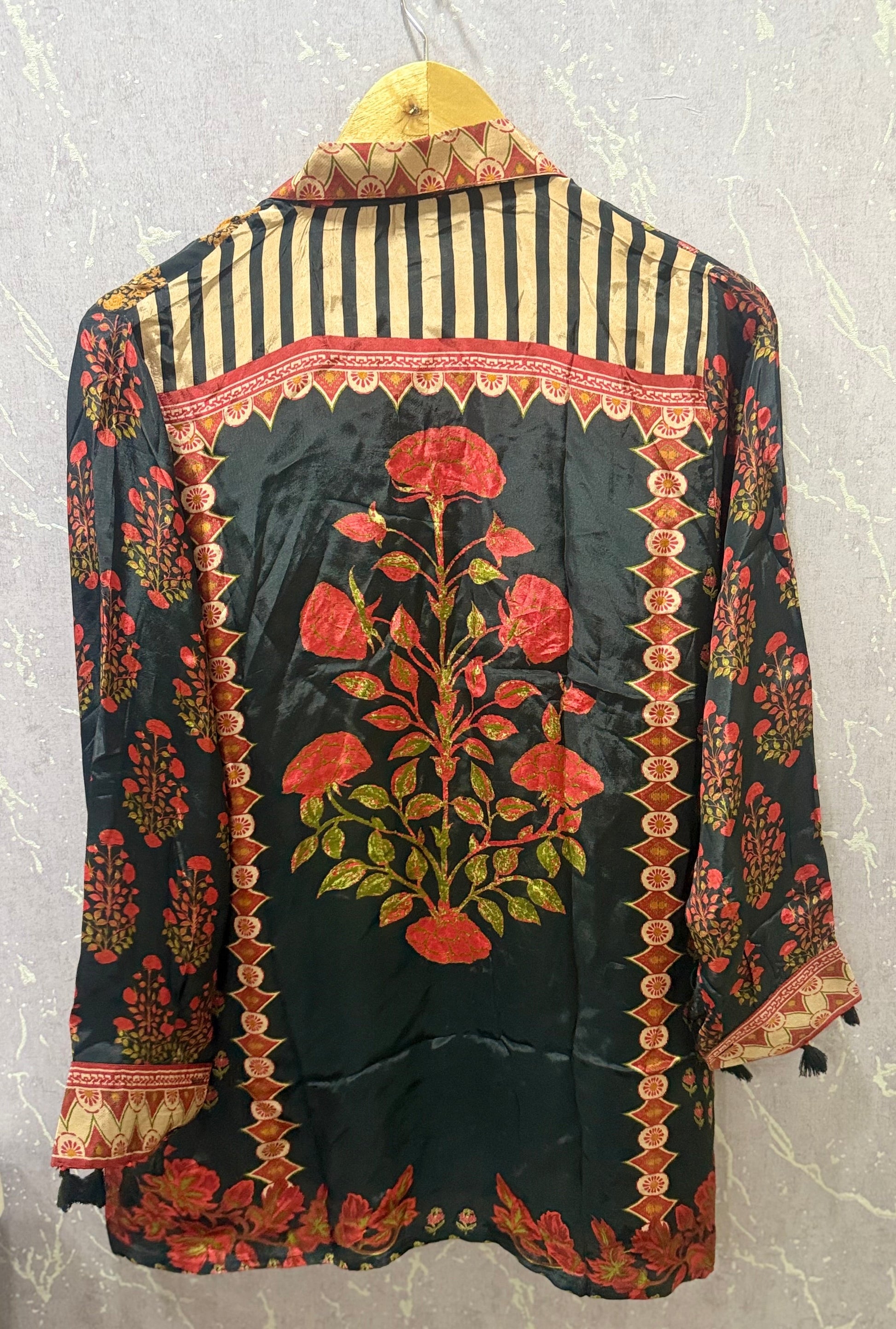 Crafted in premium crepe silk, the fabric offers a smooth texture with a subtle matte finish. It drapes beautifully without sticking to the body, making it comfortable even during long days.