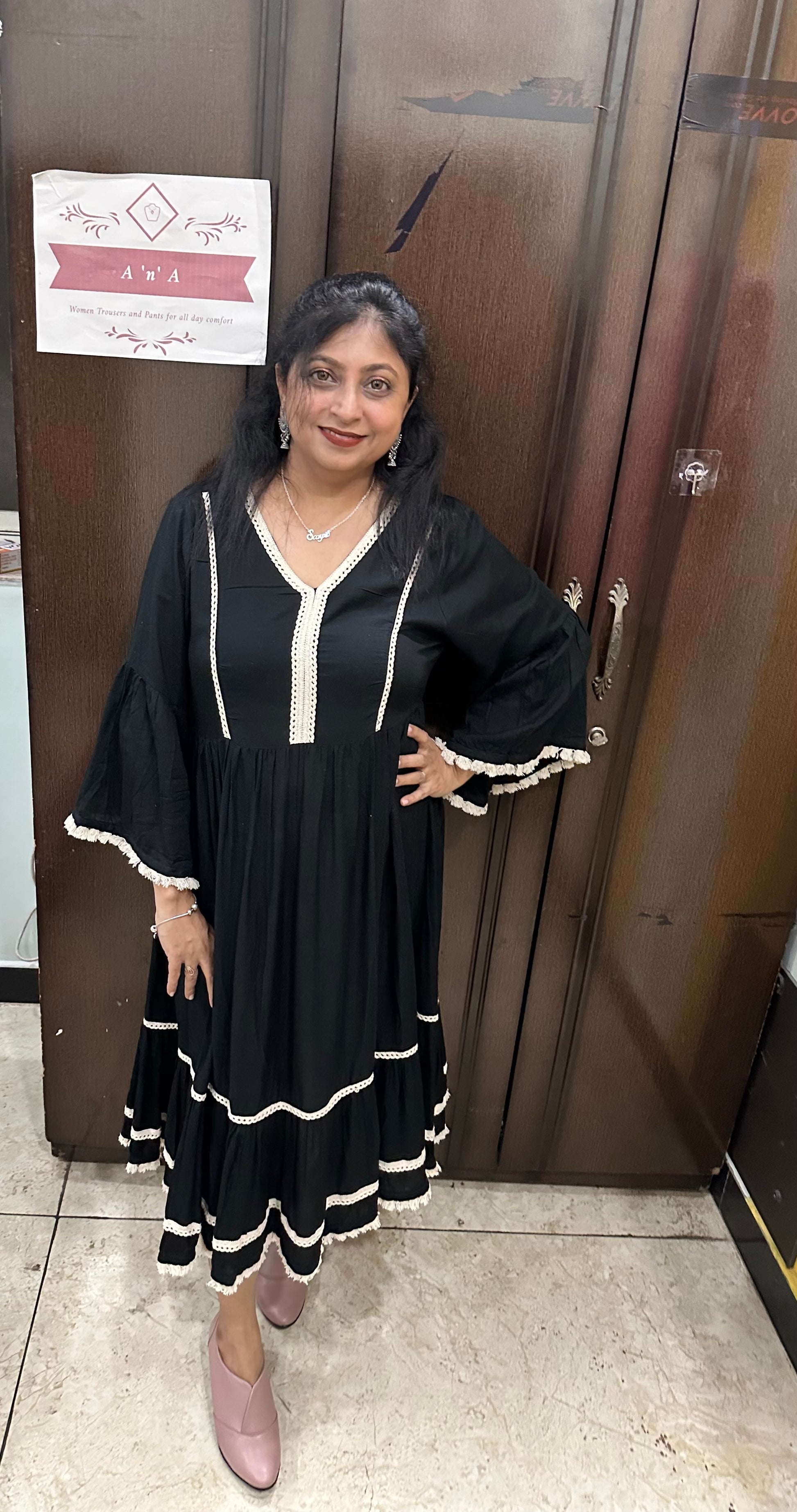 Black Dress with crochet detailing is a beautiful calf length dress in cotton material. This dress suits all your office parties, brunch, kitties and friends reunion parties.
