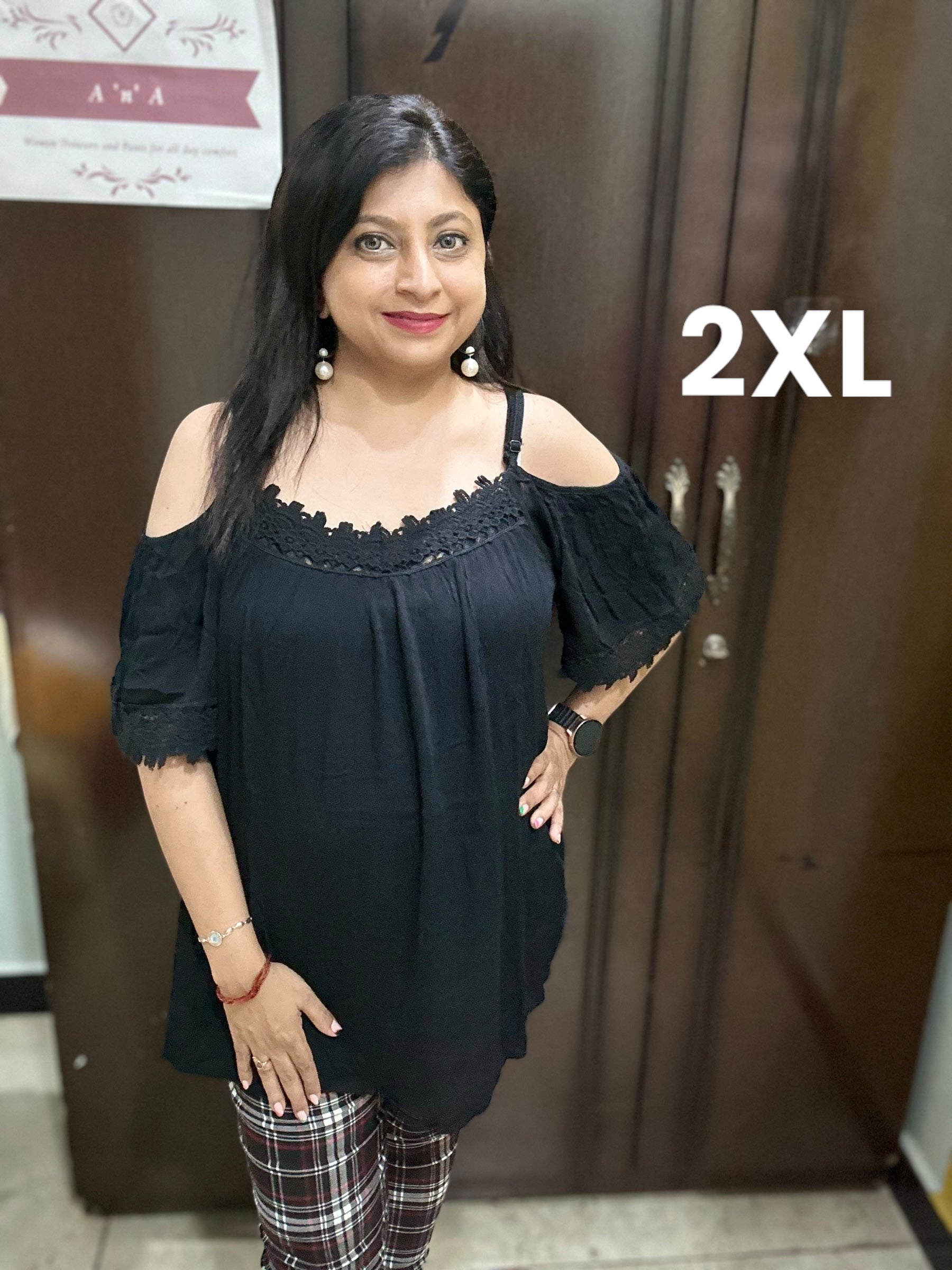 Black Top with Strapes is perfect for both formal and casual occasions. The top is in a hip-covering pattern and can be Paired with cropped or straight pants for a stylish look. Made from high-quality cotton fabric, this top is a must-have for your wardrobe. Detailing of lace can be found across the neck and sleeves